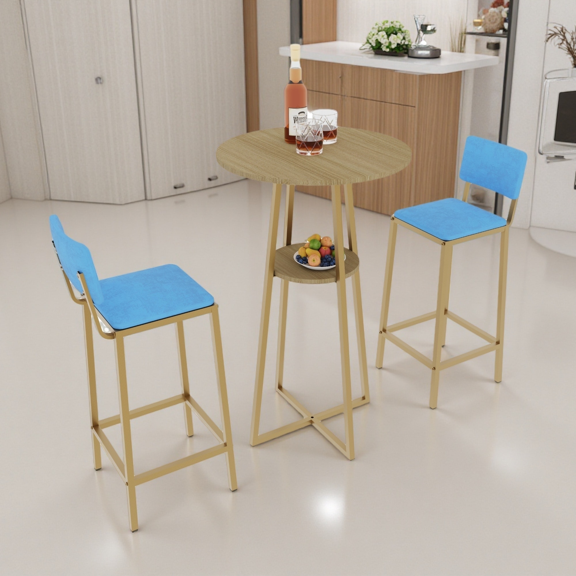 Product Features This three piece set of bar tables and chairs is exquisite, lightweight, beautiful, practical, and easy to install The gold-plated iron frame appears noble and grand, and the tabletop and lower small layer board of the bar table are made…