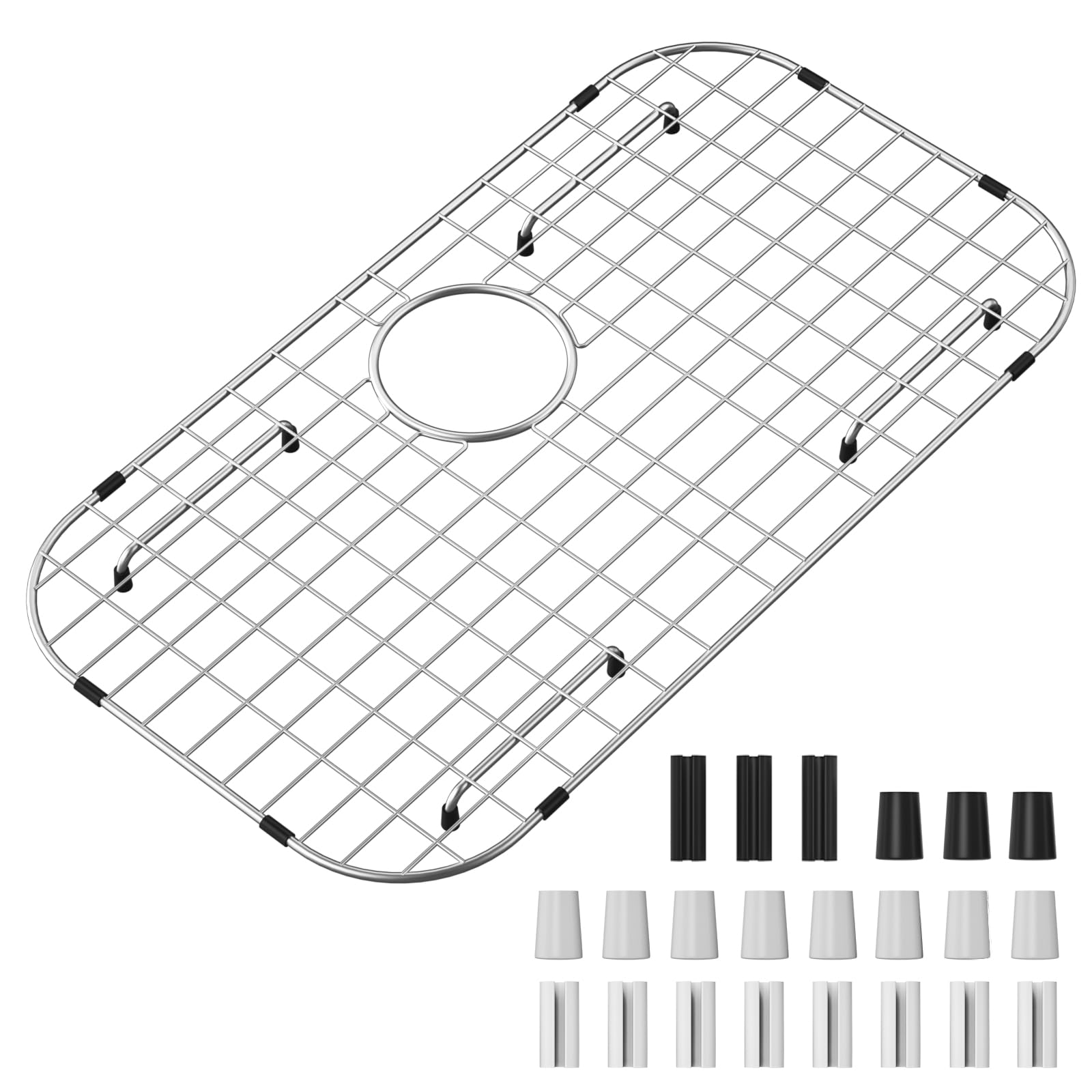 Sink Protector with REAR DRAIN LOCATION Grid dimension: 26-1/16" X 14-1/16" for your sink bottom with Corner Radius 3-1/2" Premium stainless steel construction with light weight design to ensure durability and user-friendliness at the same time Warm Tips : If you are not sure how to measure your sin