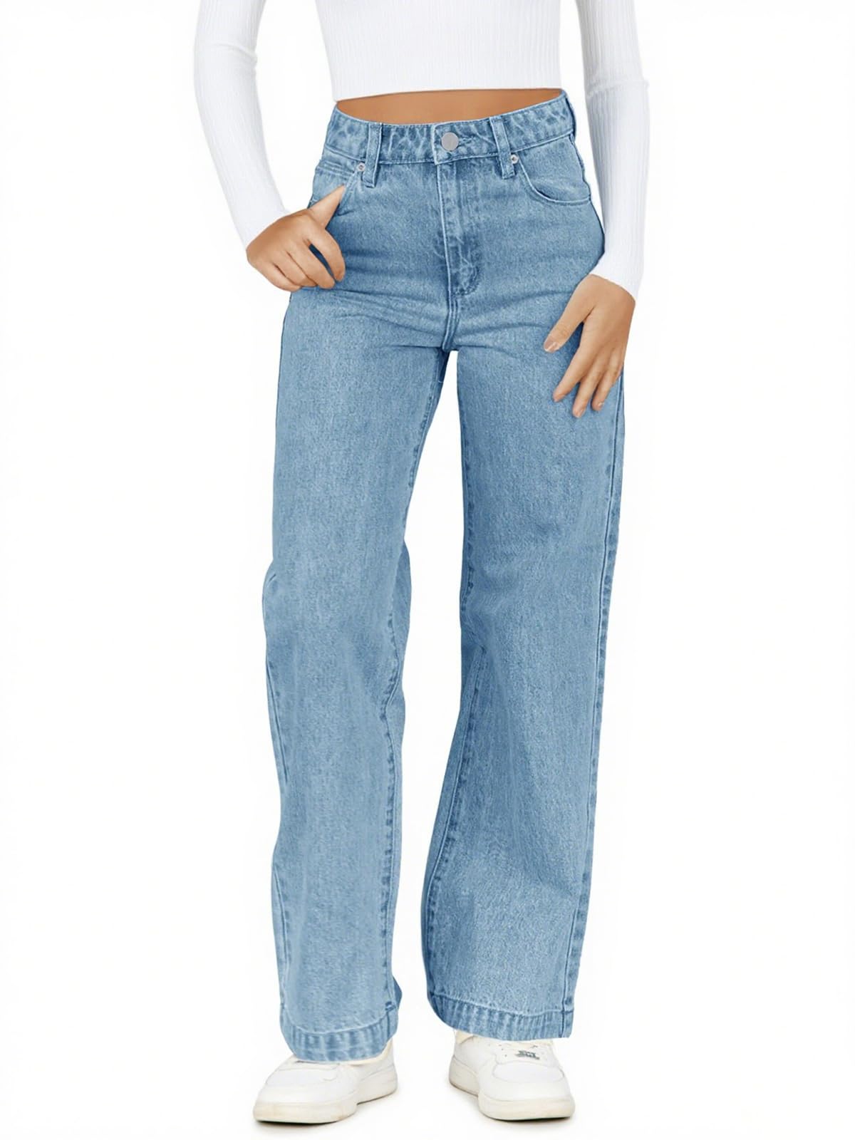High Waisted Design: The high elastic waisted design of these jeans adds a trendy touch to your little girl's outfit. It provides a flattering fit and enhances her silhouette. Straight Leg Cut: The straight leg cut of these jeans gives them a timeless and versatile look. They can be paired with a va
