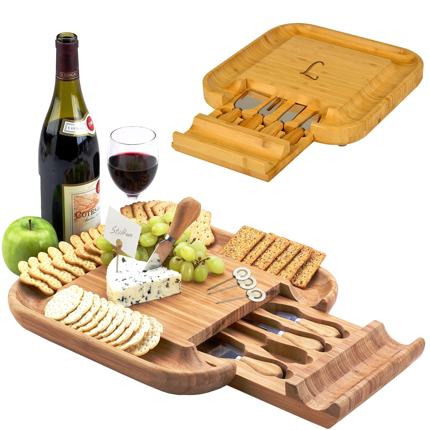 Picnic at Ascot Personalized Monogrammed Engraved Bamboo Cutting Board for Cheese & Charcuterie with Knife Set & Cheese Markers- Designed & Quality