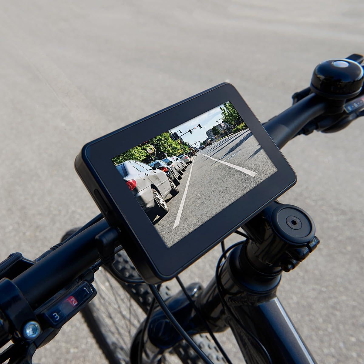 The Rearview Bicycle Camera by Sharper Image attaches easily to your seat post to help you see vehicles and traffic behind you. A 4.3” color monitor mounts on your handlebars so you can keep your eyes on the road ahead. Features a superwide 130° field of view, adjustable brightness and waterproof