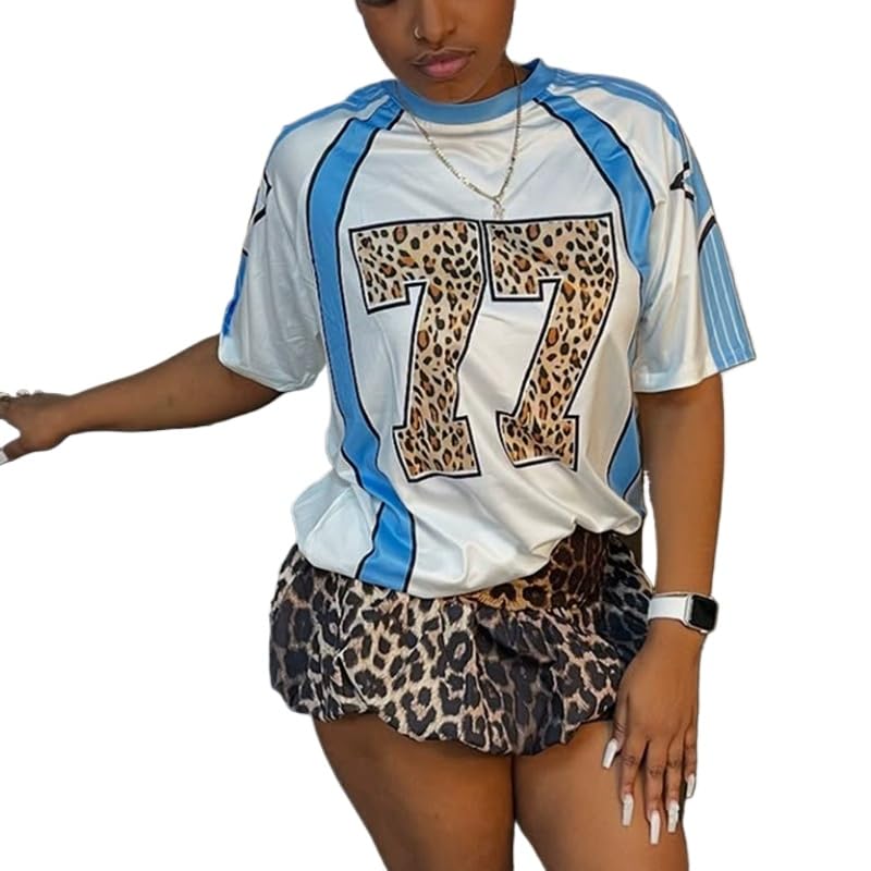 Womens Y2k Oversized T Shirts Leopard Number Print Jersey Shirts Teen Girls Casual Football Tee Streetwear Tops