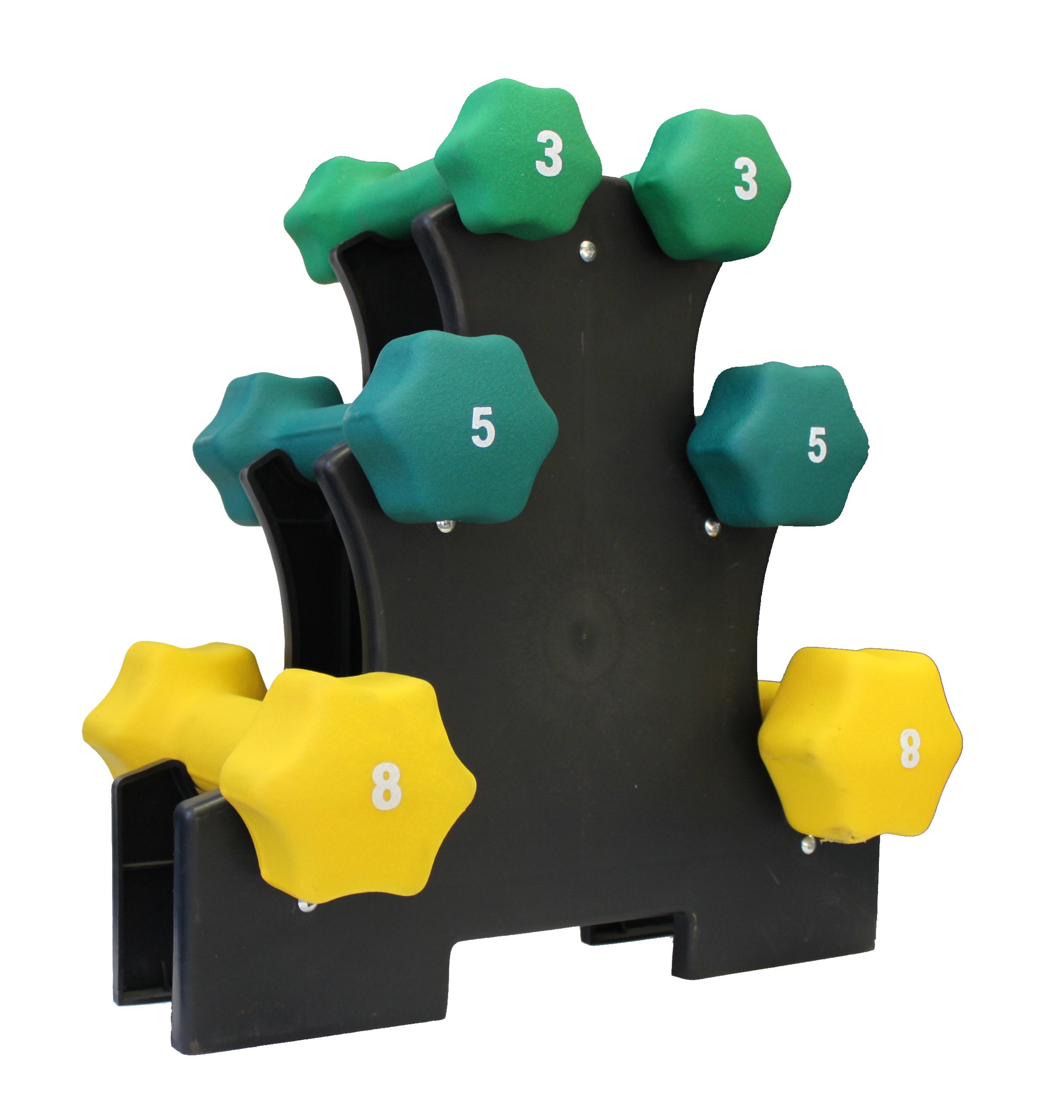 Ader multi-color neoprene dumbbell set Includes: 3, 5, 8lb neoprene dumbbells. Colors may vary. (1) Portable rack Ships to all 50 States, APO, FPO, and P.O. Box