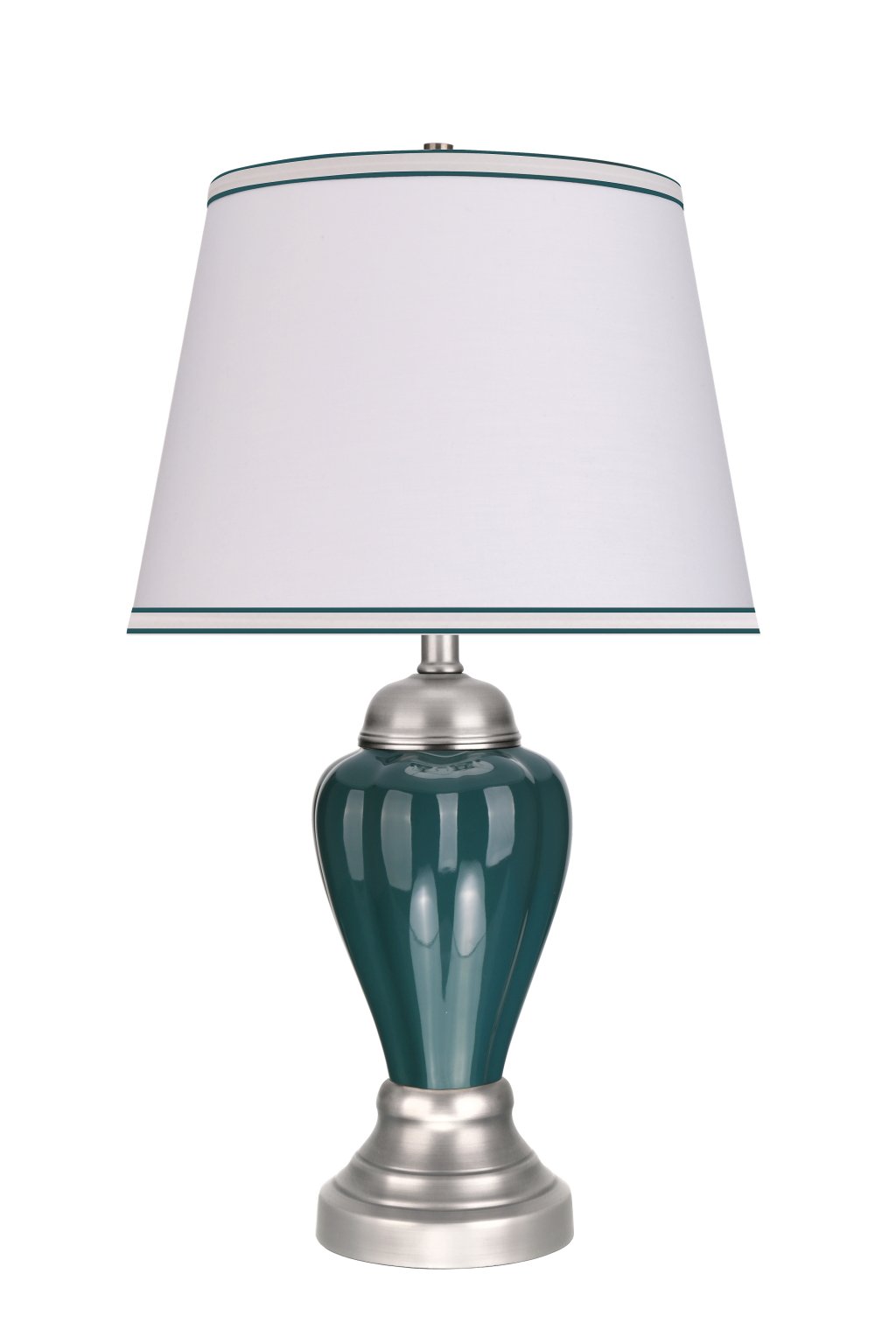 Hunter Green finish with Satin Nickel base Lampshade Color & Type - off white with Green double trim on top and bottom, Linen fabric, hardback Empire shaped lamp shade | lamp shade size - 11 inch top x 15 inch bottom x 10 1/2 inch slant height On/off switch, uses a medium base light bulb, 100 watt m