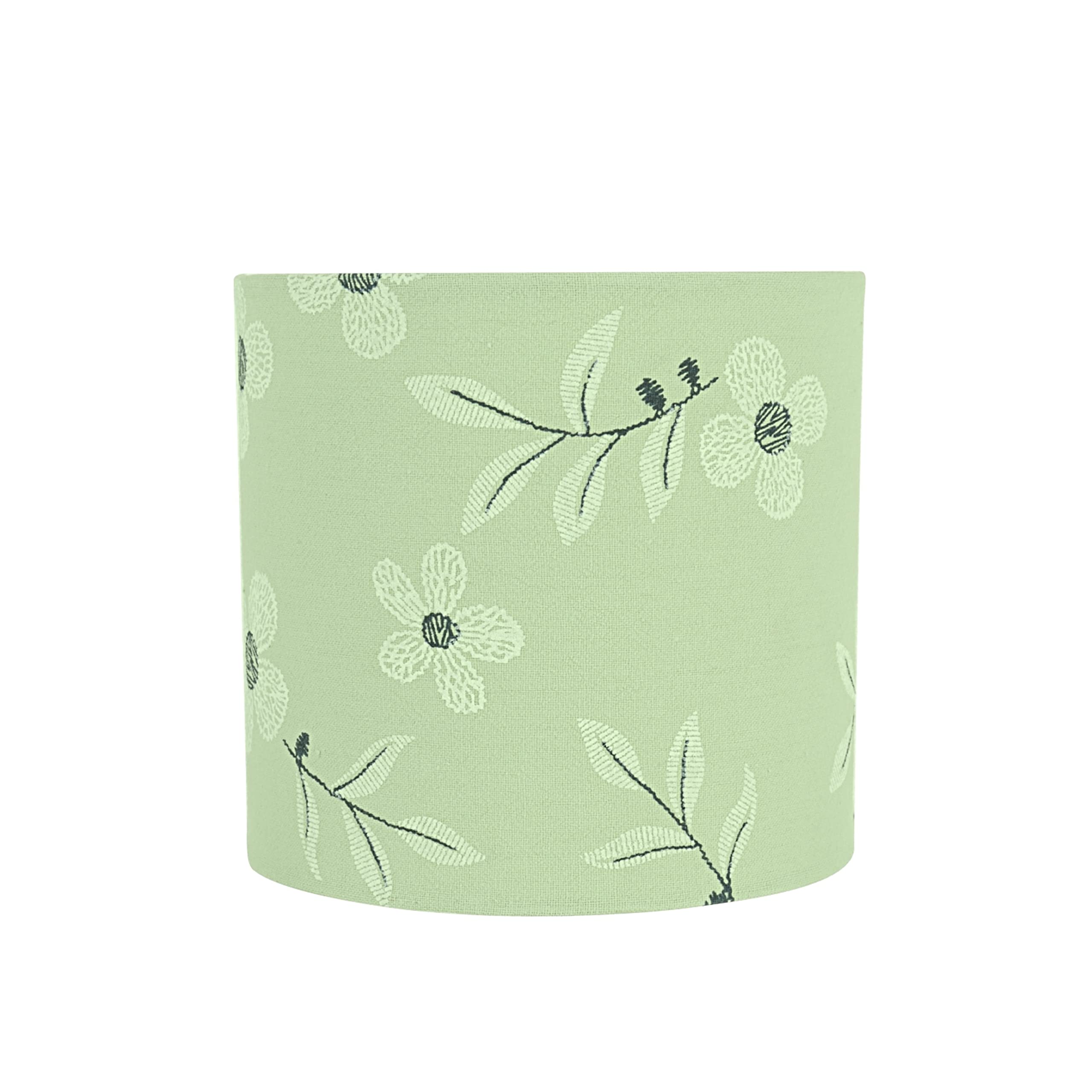 Shade Color & Material: Tea Green with White Flowers Printed Fabric With White Printed Flower Pattern | Fitter Color & Type: Brass, Clip-On fitter Shade Shape: Drum | Shade Dimensions: 5" Top x 5" Bottom x 5" Slant Height Recommended for use with 40 watt light bulb (bulbs not included) | Clip-on sty