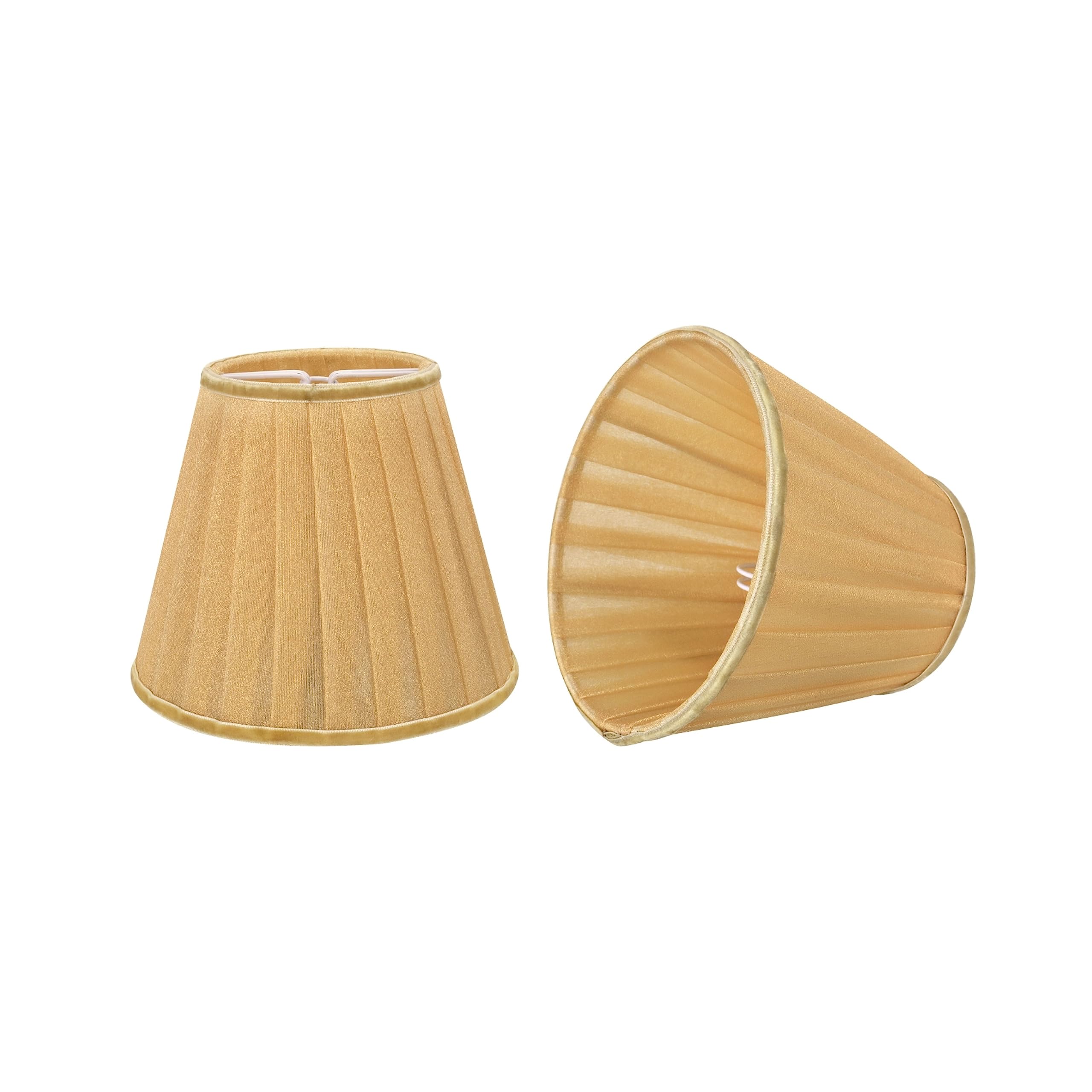 Shade Color & Material: Gold Crystal Yarn Fabric, Pleated Shade Shape: Empire Pleated| Shade Dimensions: 3" Top x 5" Bottom x 4 1/4" Slant Height Fitter Color & Type: Brass, Clip On fitter | Package includes: 2 x Clip On Lamp Shade Clip-on style fitter designed for bare torpedo chandelier bulbs (ben
