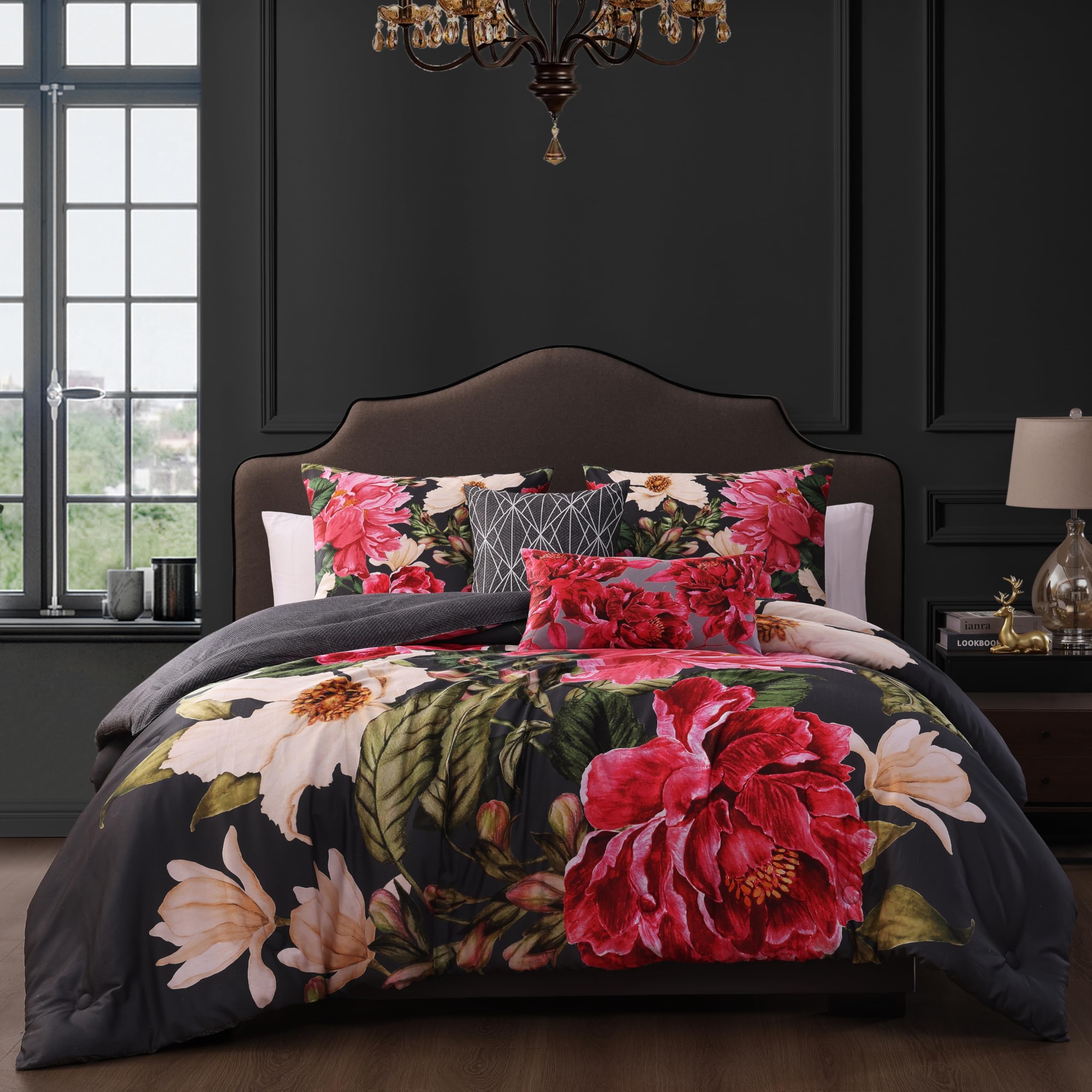 FABRIC MATERIAL- 220 Thread Count 100% Cotton Sateen. Polyfill. COMFORTER FRONT- lush garland of bright pink and ivory flowers looks stunning on a rich dark grey background COMFORTER REVERSE - reverses to a dark grey printed texture KING SET INCLUDES- 1 Comforter (106"W x 96"L), 2 King Shams (36"W x