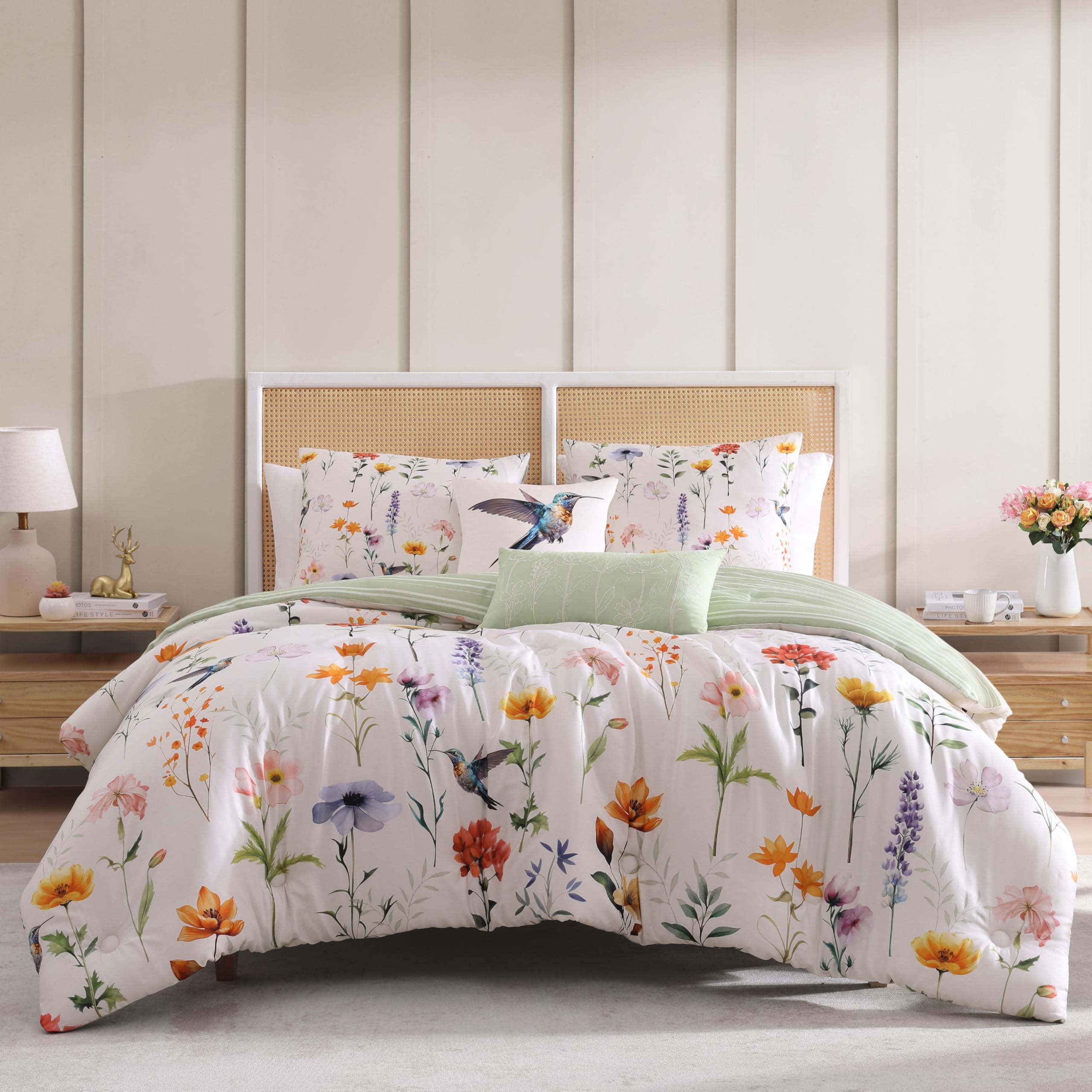 FABRIC MATERIAL- 200 Thread Count 100% Cotton Sateen. Polyfill. COMFORTER FRONT- front pattern reveals flying birds and colorful flowers scattered on a crisp white background COMFORTER REVERSE- splash of spring green with a white stripe pattern SUSTAINABLE- Comforter Set is Packed in Sustainable Fab