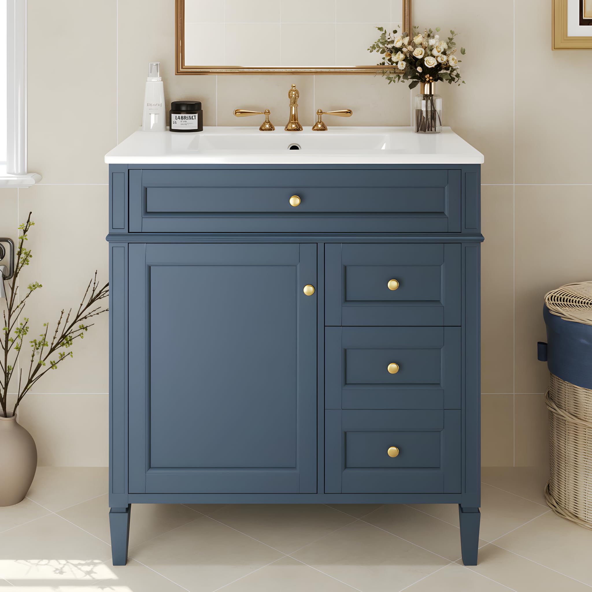 The Merax 30" bathroom vanity embraces a stylish transitional design, incorporating a solid wooden construction and neat details with a serene white sink top, making it an ideal addition for any bathroom renovation, providing plenty of storage space as well as a functional design that meets your eve