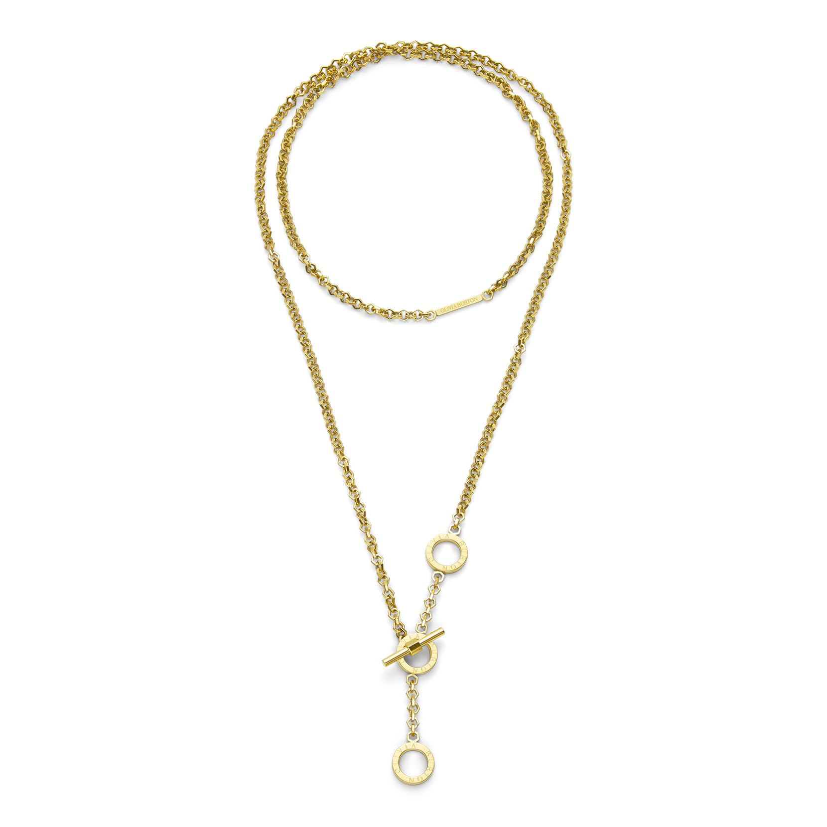 Make a statement with this gold-plated wraparound necklace. Featuring a toggle T-Bar and two loops, wear it long, short, or as a layered bracelet. Sleek hexagonal links nod to the honeycomb design. Great Fit: Measurements length 952.5 mm, chain extender 42.8 mm Toggle T-bar closure: Insert the T-bar