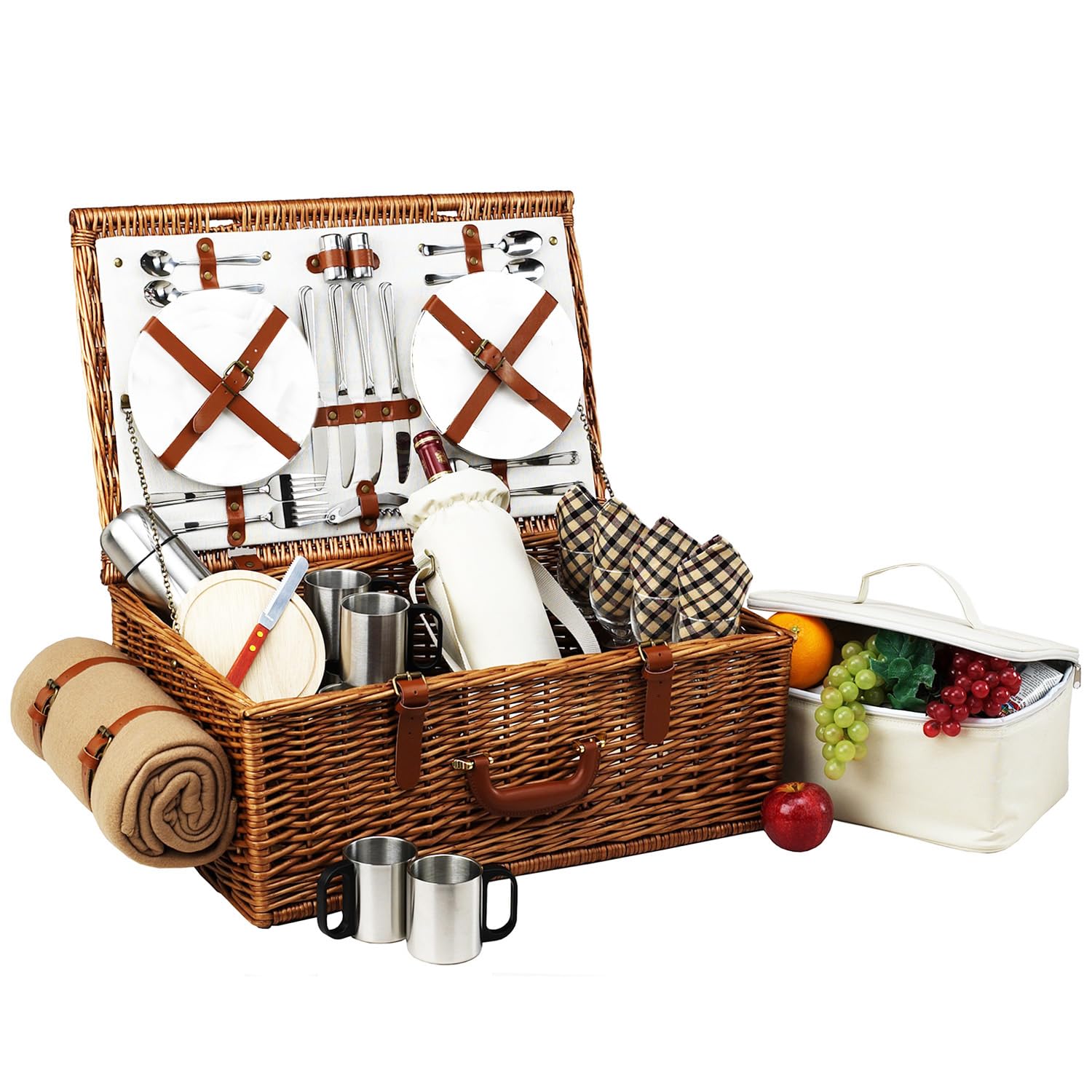 Picnic at Ascot Dorset English-Style Willow Picnic Basket with Service for 4, Coffee Set and Blanket- Designed, Assembled & Quality Approved in the